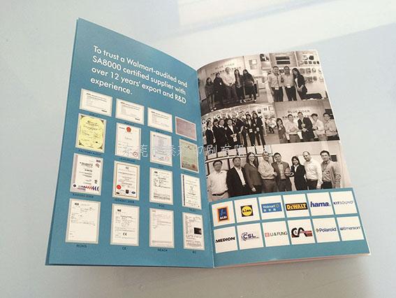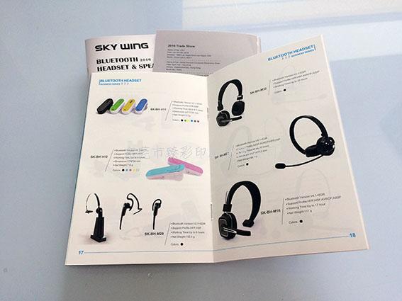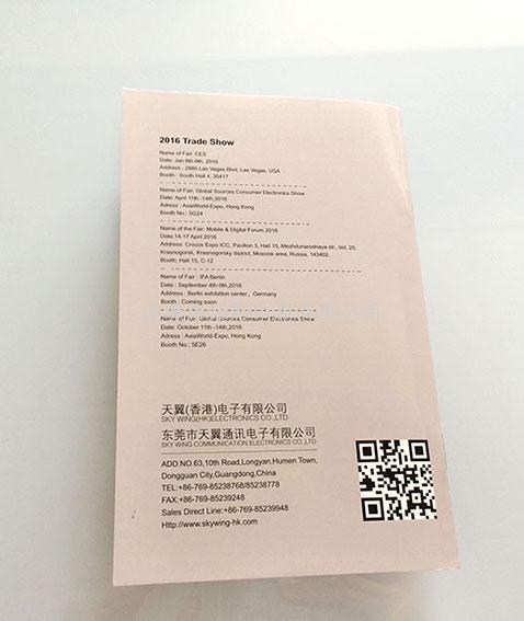 品名:东莞市天翼通讯电子产品画册,尺寸:11.5*18cm, 页码:32P,骑马钉。表面处理:封面封底双面哑胶,内页双面光油。